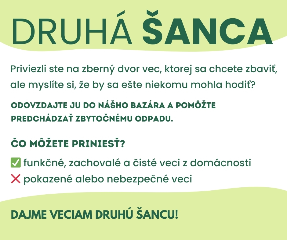 Projekt s názvom Druhá šanca, ktorého cieľom je podporiť opätovné využitie stále funkčných predmetov a znižovať množstvo odpadu. Ide o novú iniciatívu, ktorá ponúka obyvateľom možnosť odovzdať veci, ktoré už nepotrebujú, no zároveň sú v takom stave, že môžu poslúžiť niekomu ďalšiemu.